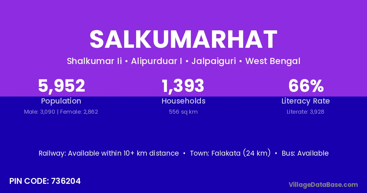 Falakata (24 km) is the nearest town to Salkumarhat village for major economic activities and is located approximately 24 km away.