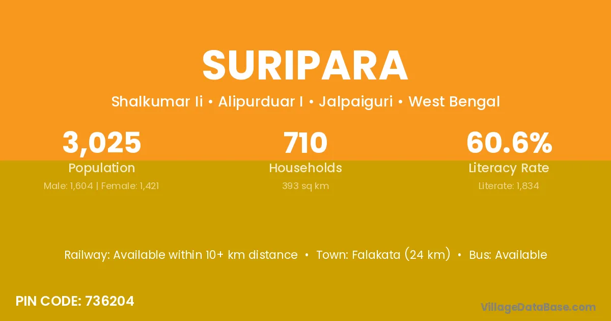 Falakata (24 km) is the nearest town to Suripara village for major economic activities and is located approximately 24 km away.