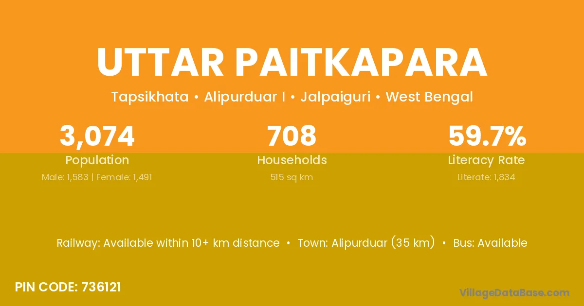 Alipurduar (35 km) is the nearest town to Uttar Paitkapara village for major economic activities and is located approximately 35 km away.