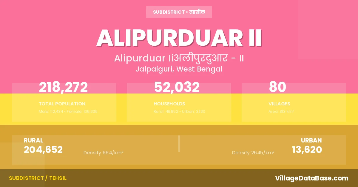 According to the 2011 census The total area of Alipurduar II Subdivision is 313 km², with a population of 218272 people. The population density is 697 inhabitants per square kilometre, and there are approximately 52032 houses in the sub district.
