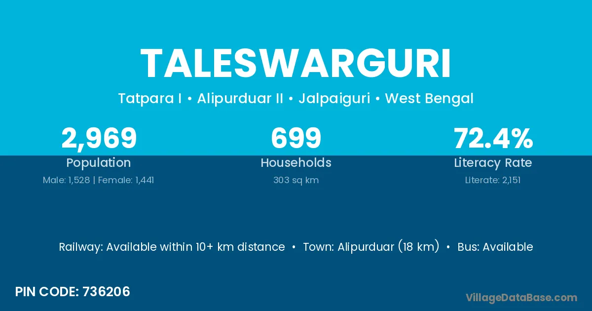 Alipurduar (18 km) is the nearest town to Taleswarguri village for major economic activities and is located approximately 18 km away.