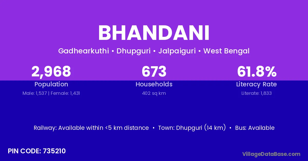 Dhupguri (14 km) is the nearest town to Bhandani village for major economic activities and is located approximately 14 km away.