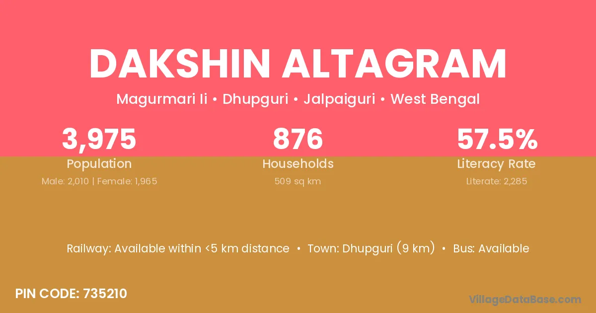 Dhupguri (9 km) is the nearest town to Dakshin Altagram village for major economic activities and is located approximately 9 km away.