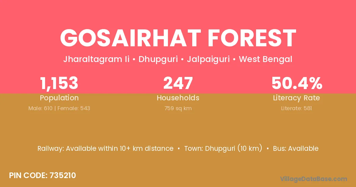 Dhupguri (10 km) is the nearest town to Gosairhat Forest village for major economic activities and is located approximately 10 km away.