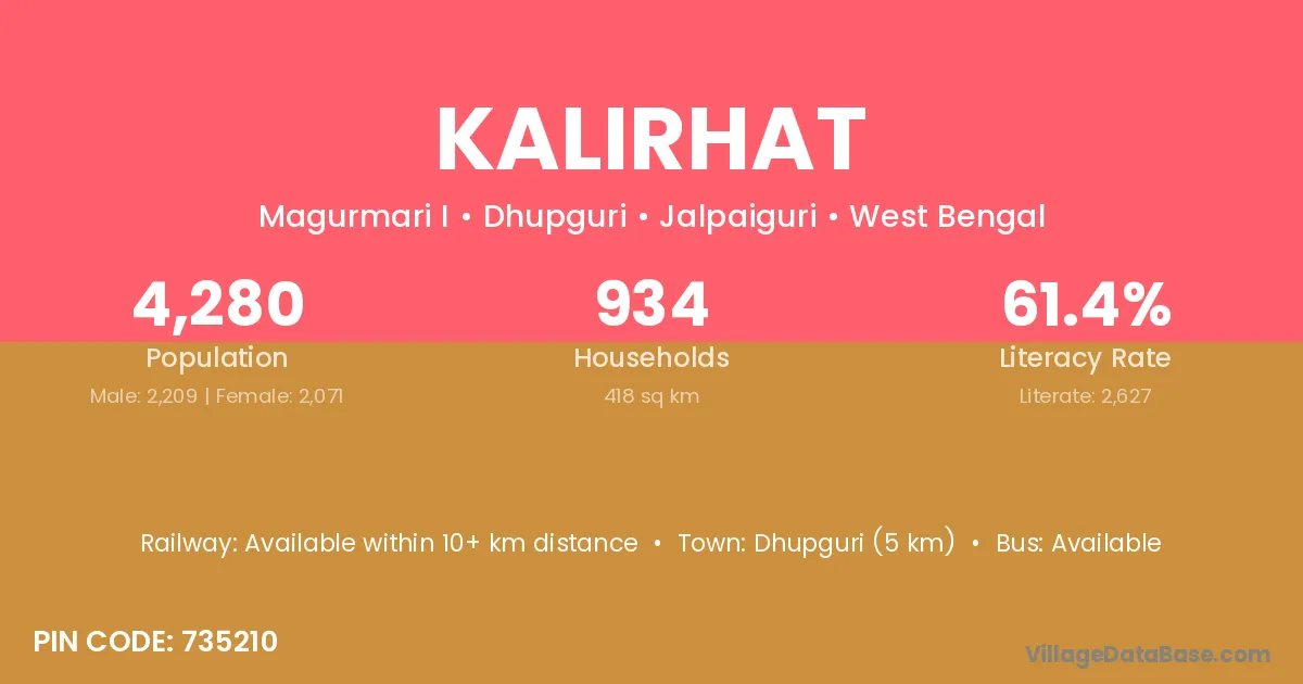 Dhupguri (5 km) is the nearest town to Kalirhat village for major economic activities and is located approximately 5 km away.