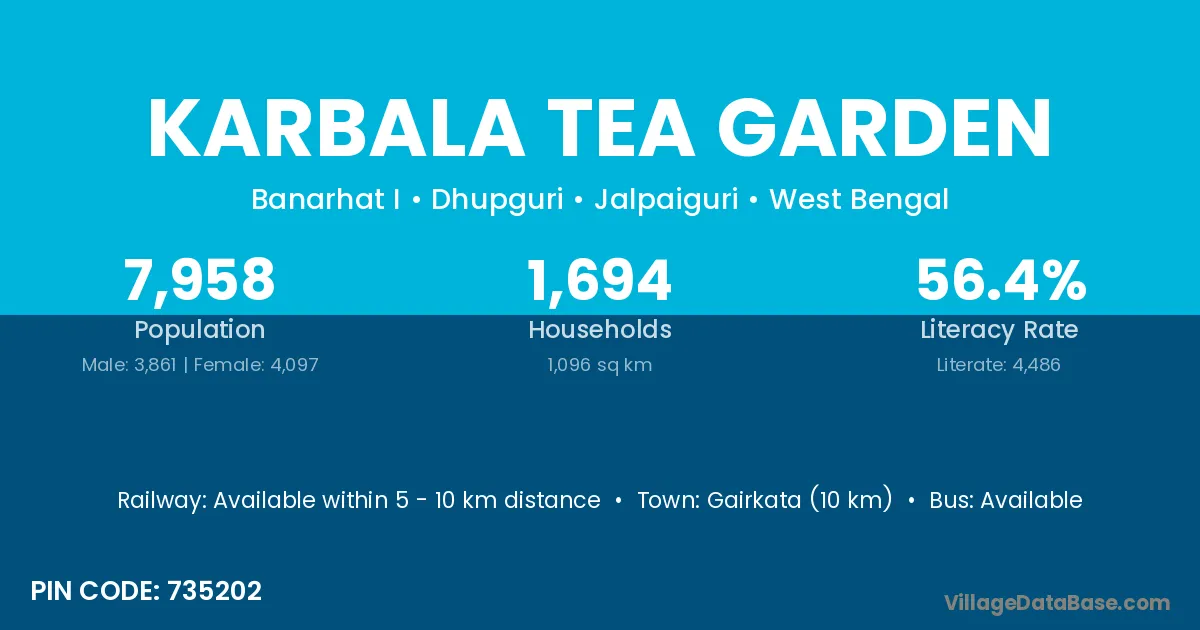 Gairkata (10 km) is the nearest town to Karbala Tea Garden village for major economic activities and is located approximately 10 km away.