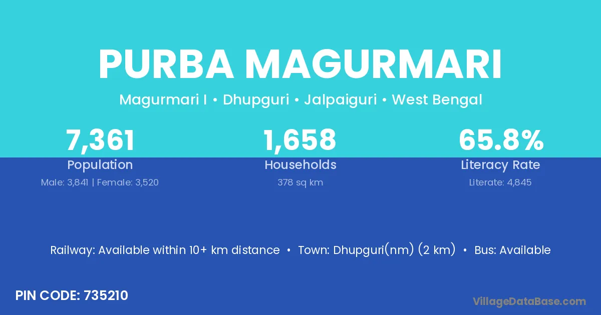 Dhupguri(nm) (2 km) is the nearest town to Purba Magurmari village for major economic activities and is located approximately 2 km away.