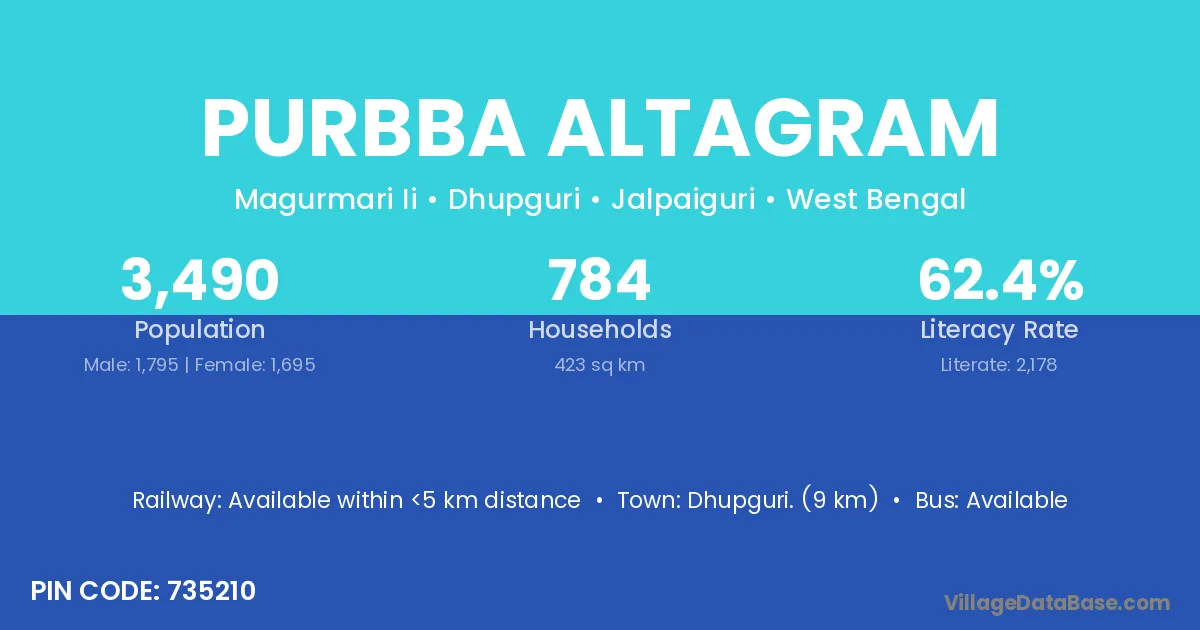 Dhupguri. (9 km) is the nearest town to Purbba Altagram village for major economic activities and is located approximately 9 km away.