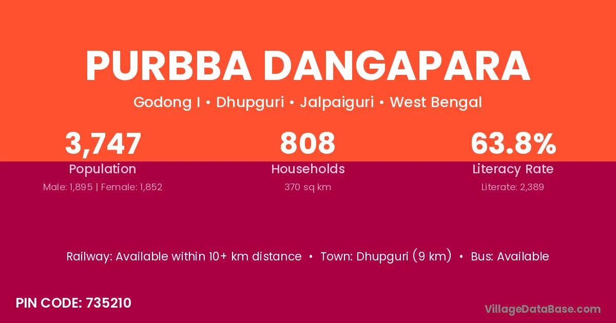 Purbba Dangapara village has a total population of 3,747 people, of which 1,895 are males and 1,852 are females.