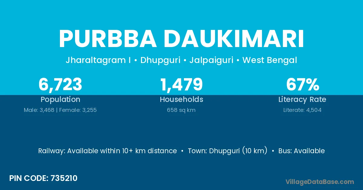 Dhupguri (10 km) is the nearest town to Purbba Daukimari village for major economic activities and is located approximately 10 km away.