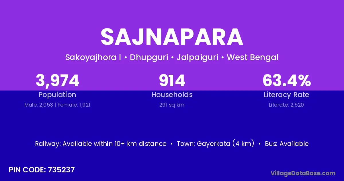 Gayerkata (4 km) is the nearest town to Sajnapara village for major economic activities and is located approximately 4 km away.