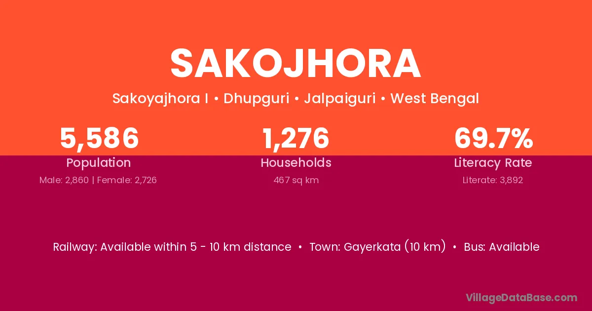 Gayerkata (10 km) is the nearest town to Sakojhora village for major economic activities and is located approximately 10 km away.