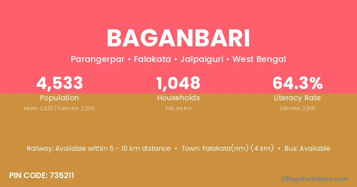 Falakata(nm) (4 km) is the nearest town to Baganbari village for major economic activities and is located approximately 4 km away.