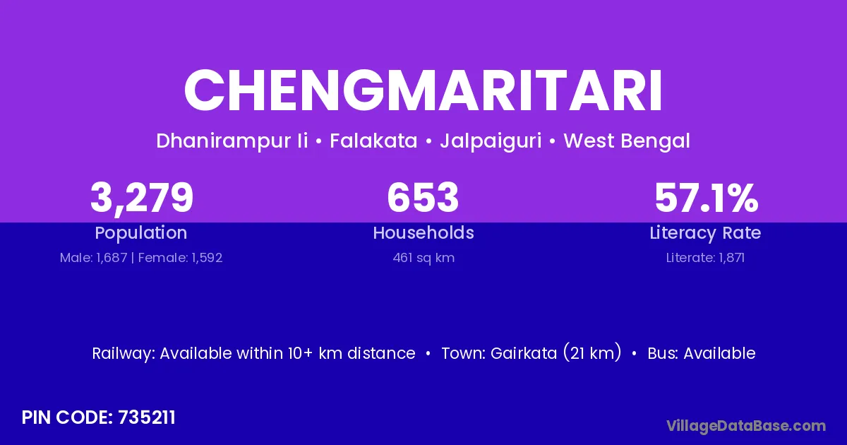 Gairkata (21 km) is the nearest town to Chengmaritari village for major economic activities and is located approximately 21 km away.