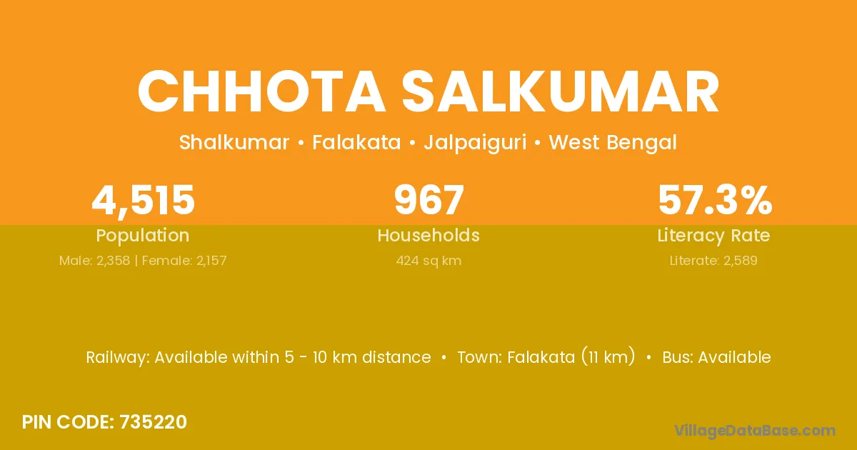 Falakata (11 km) is the nearest town to Chhota Salkumar village for major economic activities and is located approximately 11 km away.