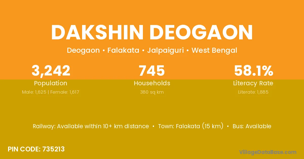Falakata (15 km) is the nearest town to Dakshin Deogaon village for major economic activities and is located approximately 15 km away.
