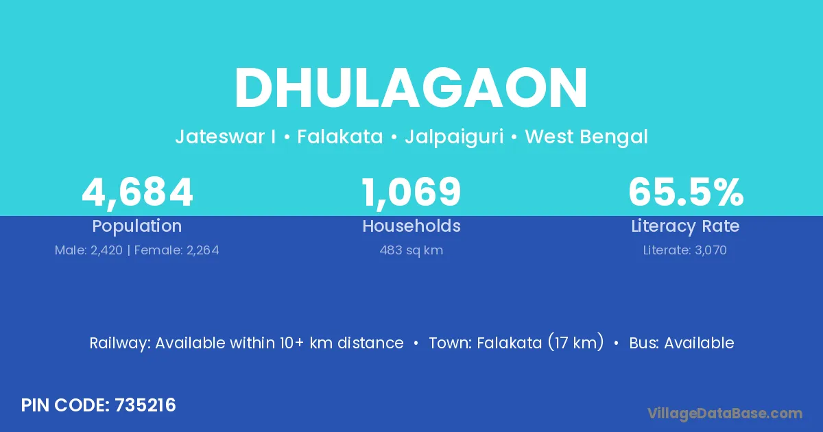Falakata (17 km) is the nearest town to Dhulagaon village for major economic activities and is located approximately 17 km away.