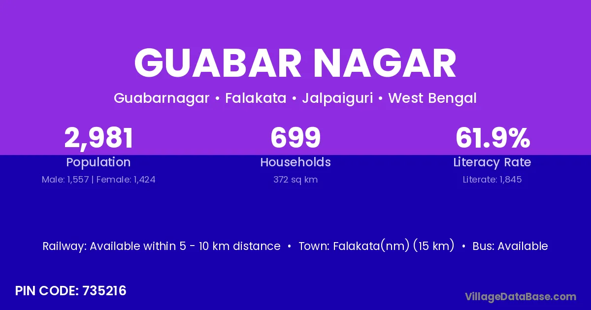 Falakata(nm) (15 km) is the nearest town to Guabar Nagar village for major economic activities and is located approximately 15 km away.