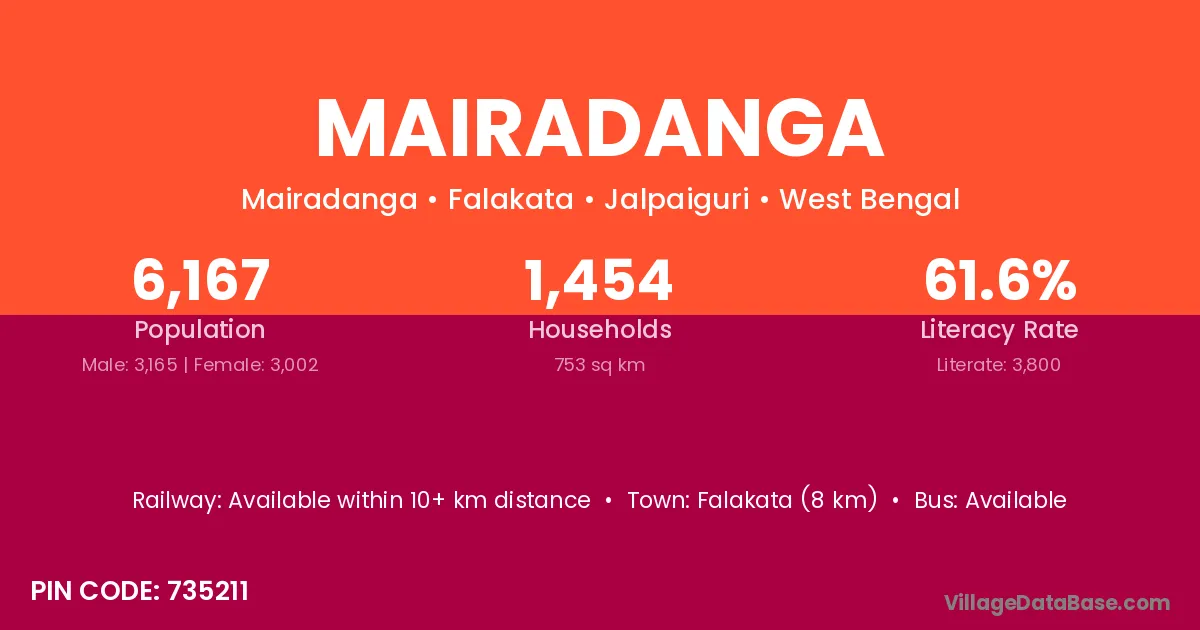 Falakata (8 km) is the nearest town to Mairadanga village for major economic activities and is located approximately 8 km away.