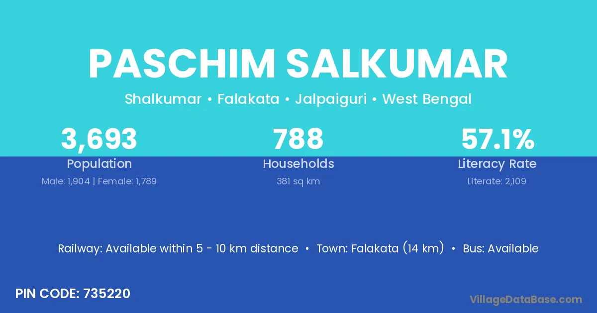 Falakata (14 km) is the nearest town to Paschim Salkumar village for major economic activities and is located approximately 14 km away.