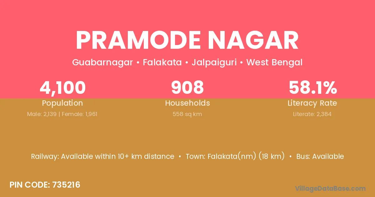 Falakata(nm) (18 km) is the nearest town to Pramode Nagar village for major economic activities and is located approximately 18 km away.