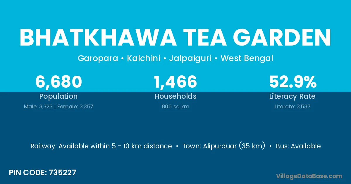 Bhatkhawa Tea Garden village has a total population of 6,680 people, of which 3,323 are males and 3,357 are females.
