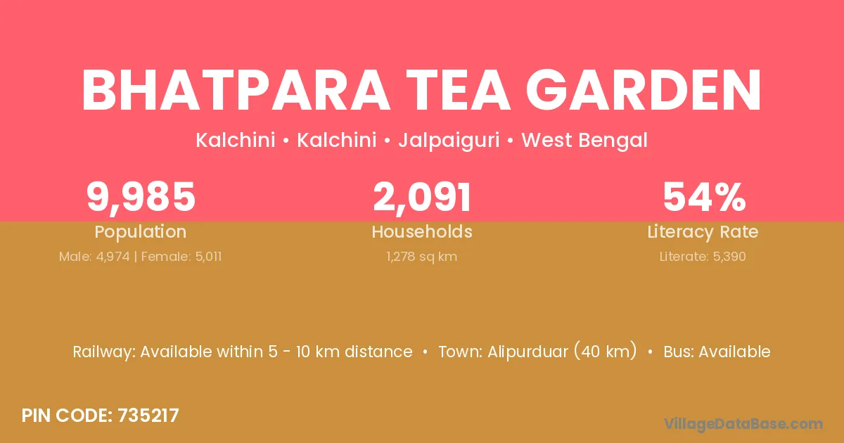 Bhatpara Tea Garden village has a total population of 9,985 people, of which 4,974 are males and 5,011 are females.