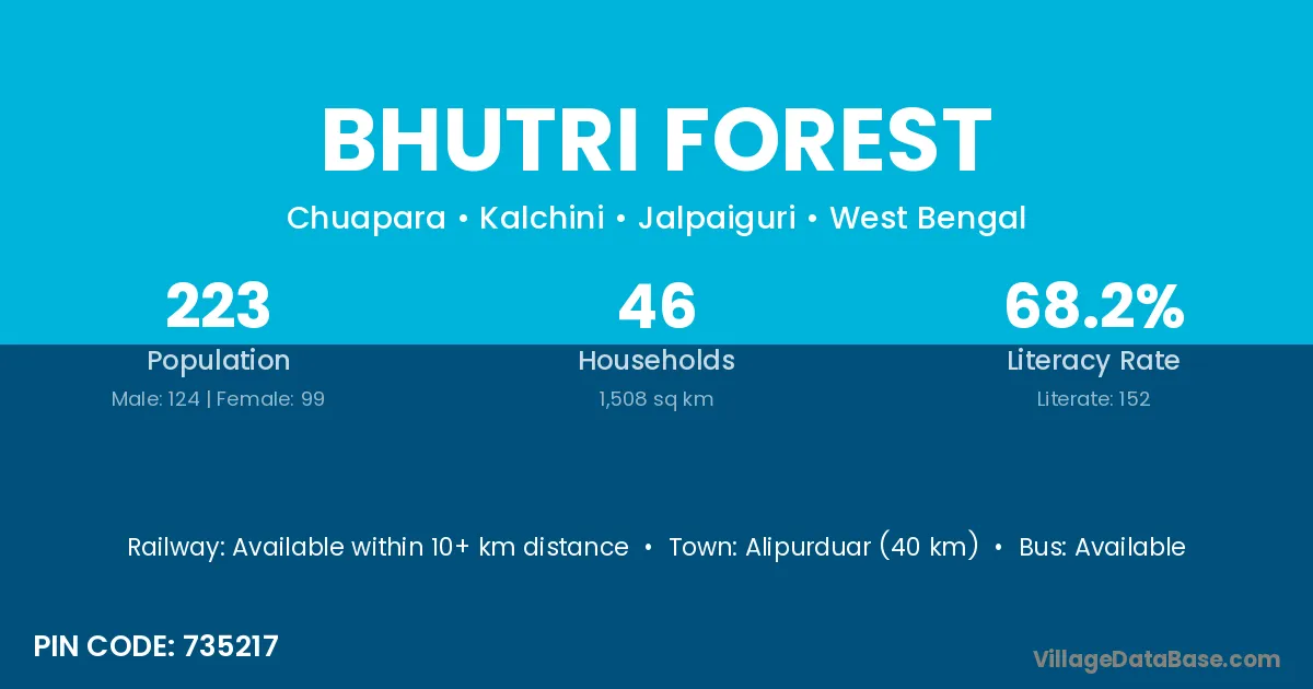 Alipurduar (40 km) is the nearest town to Bhutri Forest village for major economic activities and is located approximately 40 km away.