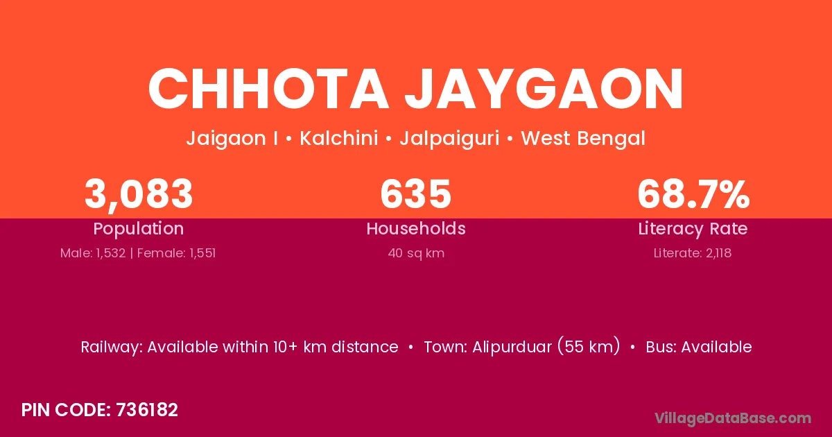 Alipurduar (55 km) is the nearest town to Chhota Jaygaon village for major economic activities and is located approximately 55 km away.