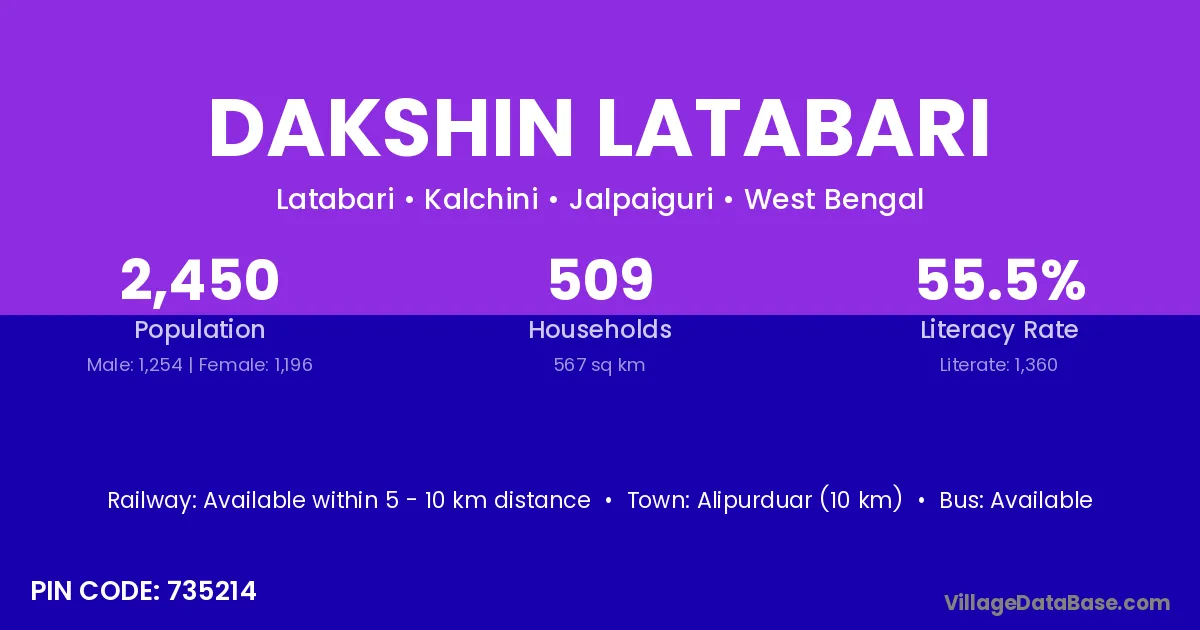 Alipurduar (10 km) is the nearest town to Dakshin Latabari village for major economic activities and is located approximately 10 km away.