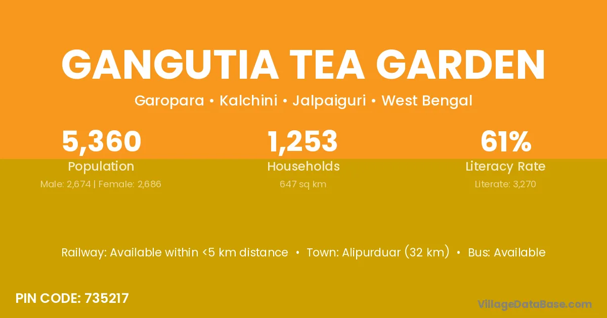 Alipurduar (32 km) is the nearest town to Gangutia Tea Garden village for major economic activities and is located approximately 32 km away.