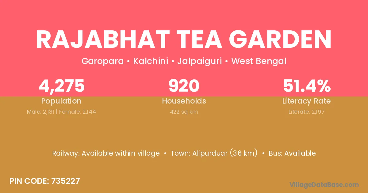 Alipurduar (36 km) is the nearest town to Rajabhat Tea Garden village for major economic activities and is located approximately 36 km away.