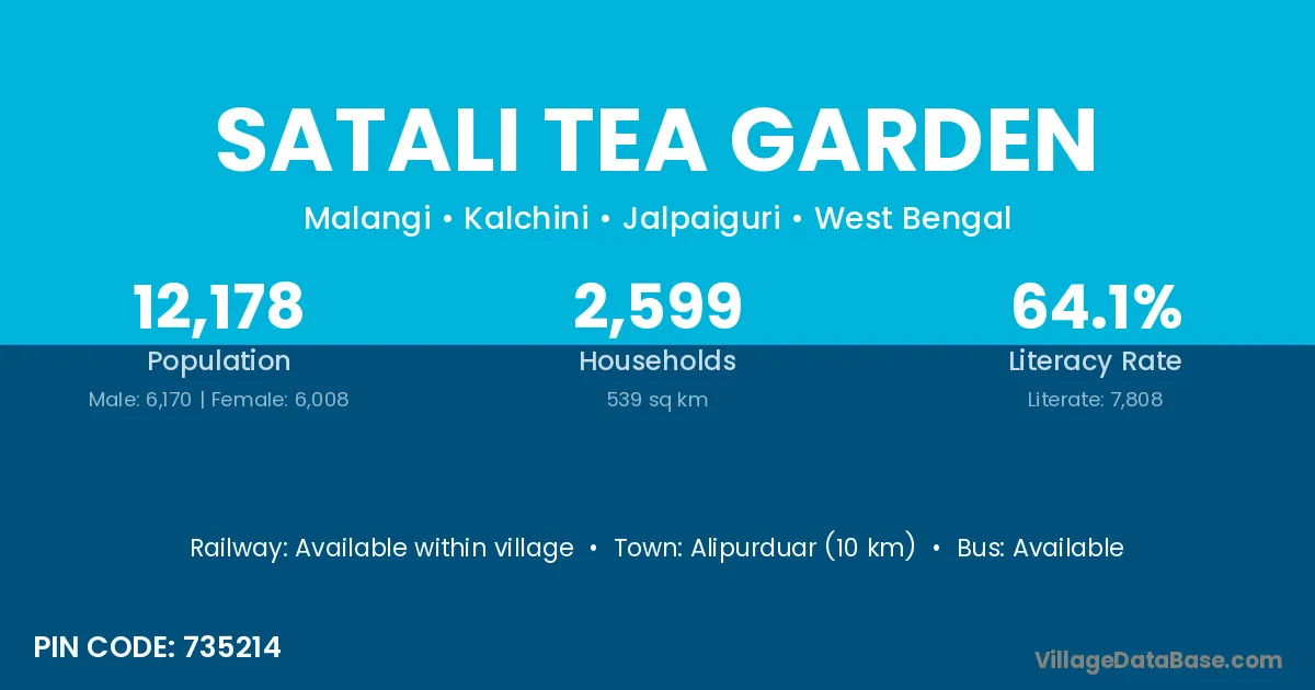 Satali Tea Garden village has a total population of 12,178 people, of which 6,170 are males and 6,008 are females.