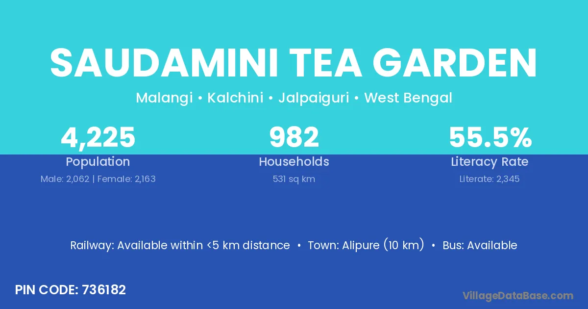 Saudamini Tea Garden village has a total population of 4,225 people, of which 2,062 are males and 2,163 are females.