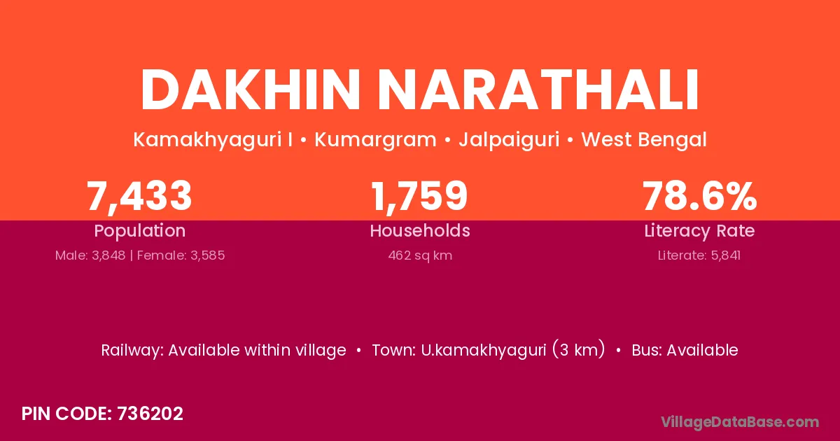 Dakhin Narathali village has a total population of 7,433 people, of which 3,848 are males and 3,585 are females.