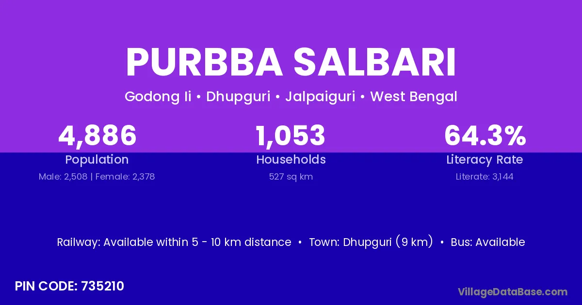 U.kamakhyaguri (20 km) is the nearest town to Purbba Salbari village for major economic activities and is located approximately 20 km away.