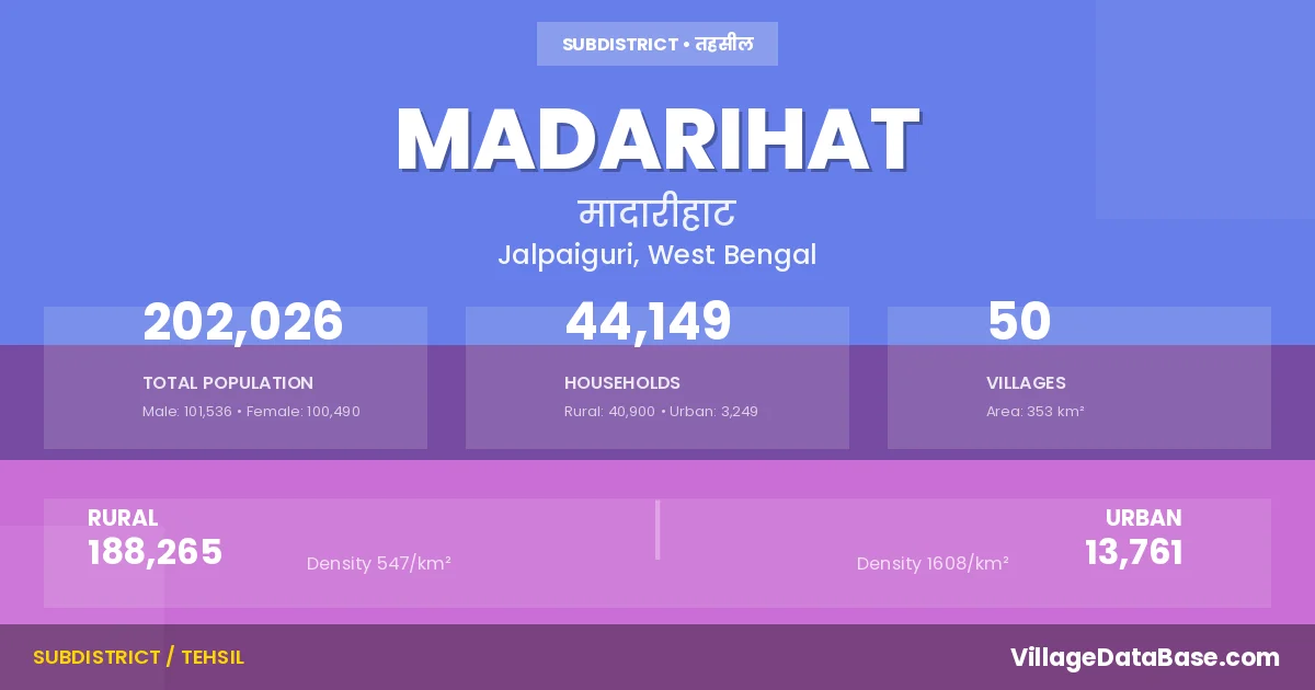 According to the 2011 census The total area of Madarihat Subdivision is 353 km², with a population of 202026 people. The population density is 573 inhabitants per square kilometre, and there are approximately 44149 houses in the sub district.