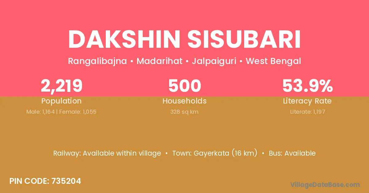 Dakshin Sisubari village has a total population of 2,219 people, of which 1,164 are males and 1,055 are females.