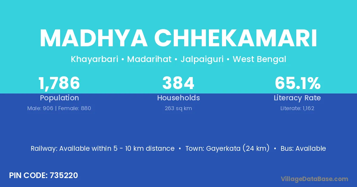 Gayerkata (24 km) is the nearest town to Madhya Chhekamari village for major economic activities and is located approximately 24 km away.