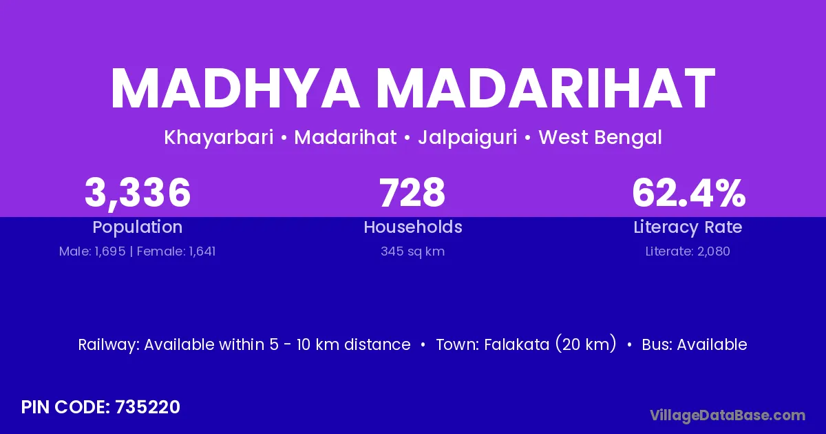 Falakata (20 km) is the nearest town to Madhya Madarihat village for major economic activities and is located approximately 20 km away.