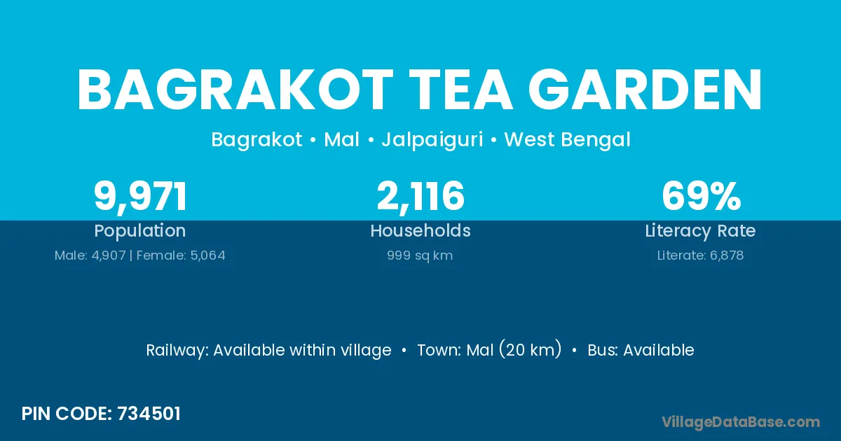 Bagrakot Tea Garden village has a total population of 9,971 people, of which 4,907 are males and 5,064 are females.