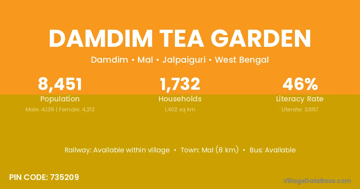 Mal (8 km) is the nearest town to Damdim Tea Garden village for major economic activities and is located approximately 8 km away.