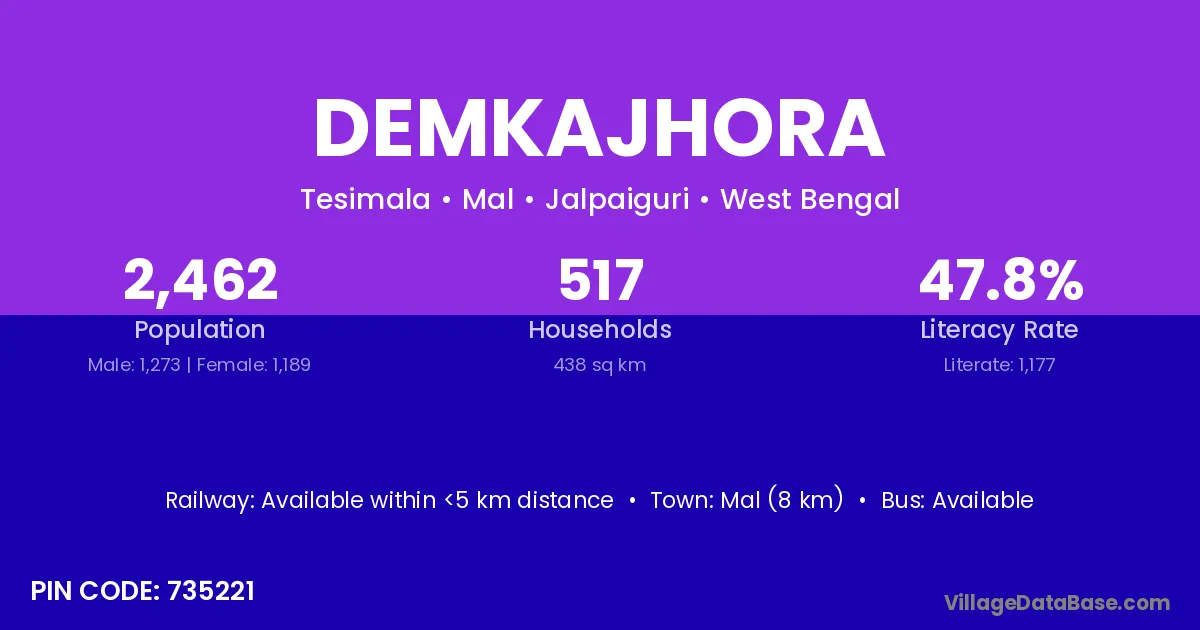 Mal (8 km) is the nearest town to Demkajhora village for major economic activities and is located approximately 8 km away.