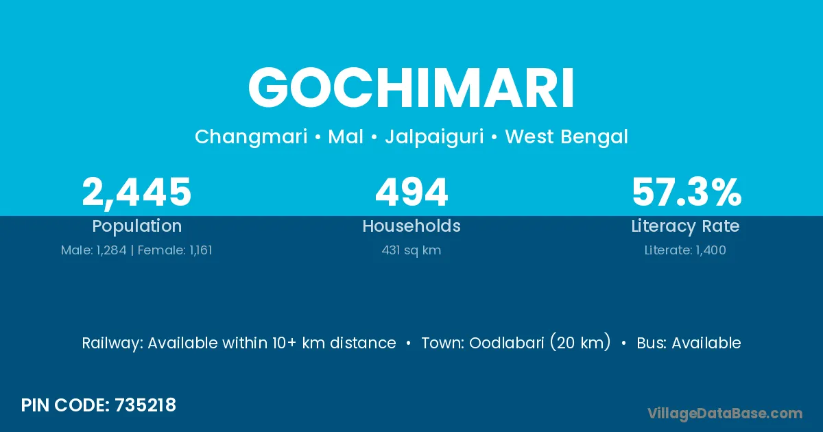 Oodlabari (20 km) is the nearest town to Gochimari village for major economic activities and is located approximately 20 km away.