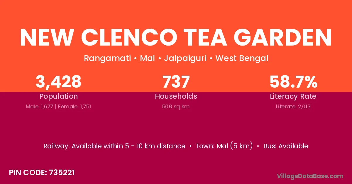 Mal (5 km) is the nearest town to New Clenco Tea Garden village for major economic activities and is located approximately 5 km away.