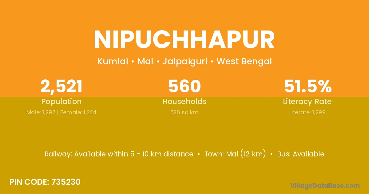 Mal (12 km) is the nearest town to Nipuchhapur village for major economic activities and is located approximately 12 km away.