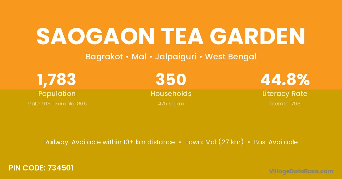Saogaon Tea Garden village has a total population of 1,783 people, of which 918 are males and 865 are females.