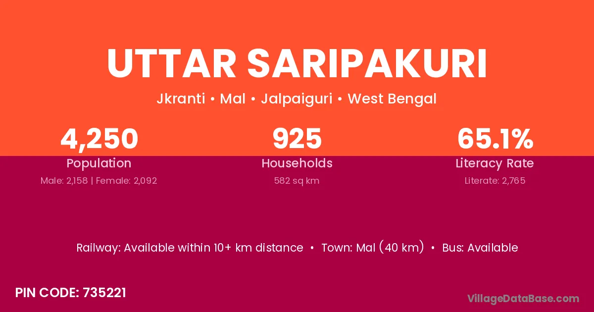 Mal (40 km) is the nearest town to Uttar Saripakuri village for major economic activities and is located approximately 40 km away.