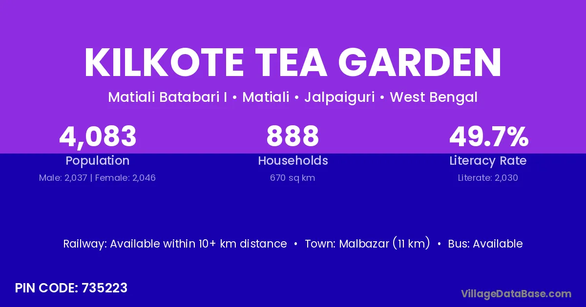 Malbazar (11 km) is the nearest town to Kilkote Tea Garden village for major economic activities and is located approximately 11 km away.