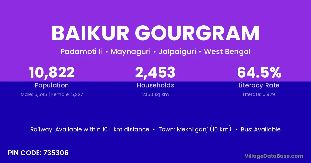 Mekhliganj (10 km) is the nearest town to Baikur Gourgram village for major economic activities and is located approximately 10 km away.